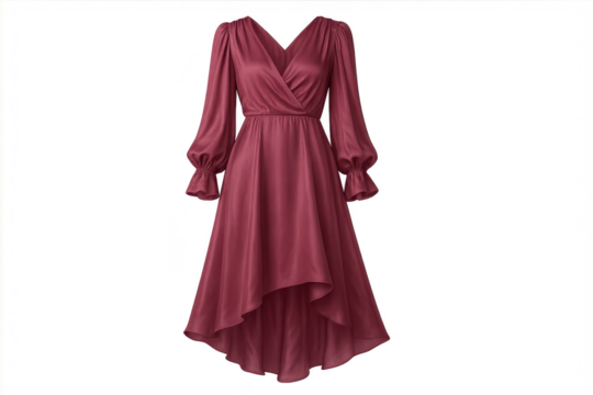 Elegant maroon high-low satin dress with puffy sleeves isolated on transparent background