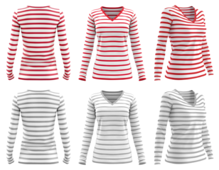 2 Set of white and red maroon grey gray stripe striped long sleeve woman tee sweater v-neck front back side view on transparent background cutout, PNG file. Mockup template for artwork design