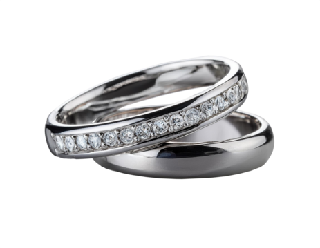 Two shiny gold wedding bands laying intertwined, cut out - stock png.