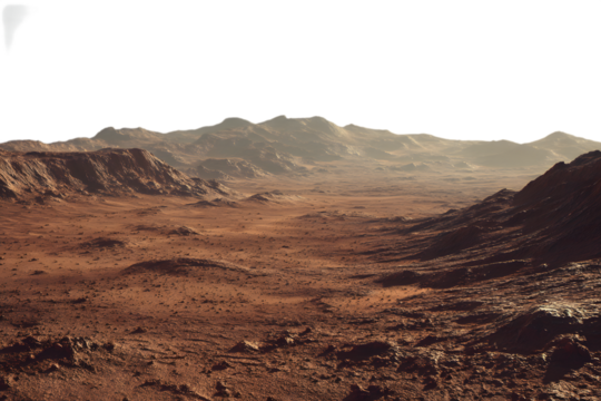 Realistic rendering of the Martian landscape, rocky terrain and dusty atmosphere of the Red Planet on a plain white background