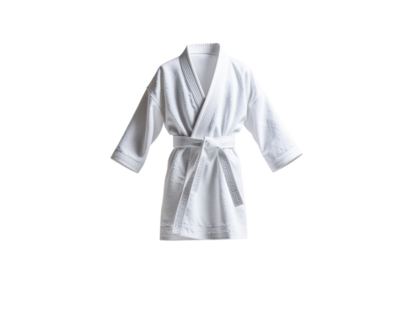 A clean white martial arts gi with a belt, displayed against a transparent background for training and competition use