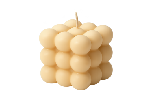 Beige cube-shaped candle made of stacked spheres with wick on top