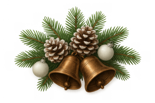 Christmas bells hanging among green fir branches with natural pine cones and white round ornaments, celebrating holiday season