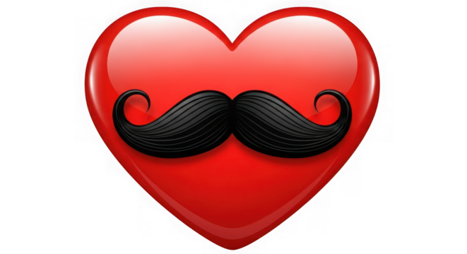 A glossy red heart emoji with a black mustache, isolated on transparent background