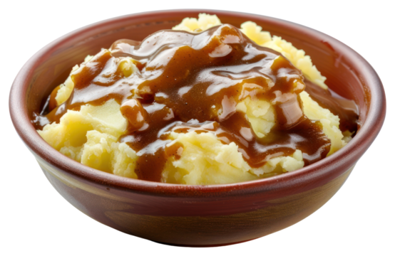 mashed potatoes with brown gravy, isolated, realistic food texture