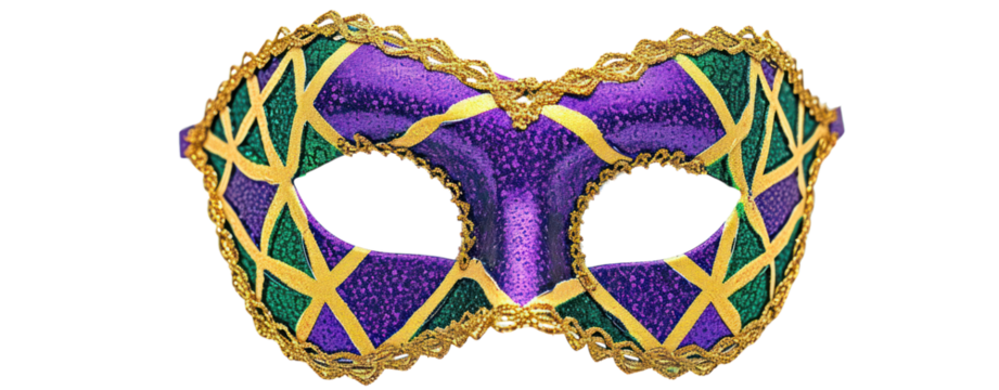 A vibrant, ornate venetian masquerade mask with intricate details and colorful embellishments, isolated on transparent background