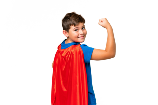 Young handsome caucasian man over isolated background in superhero costume and doing strong gesture