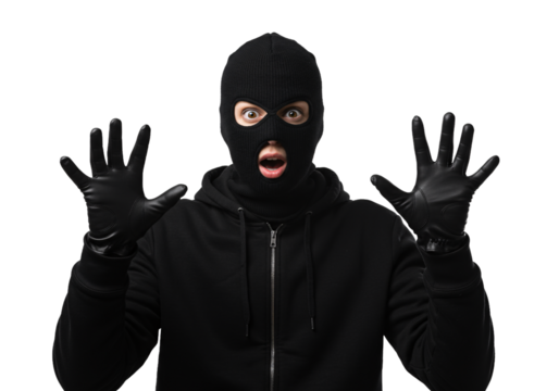 A person wearing a black ski mask and gloves with hands raised in surrender isolated on transparent background
