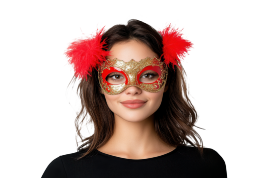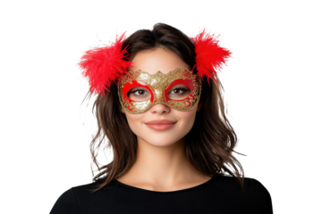 Smiling woman wearing a gold masquerade mask with red feathers isolated on a transparent background