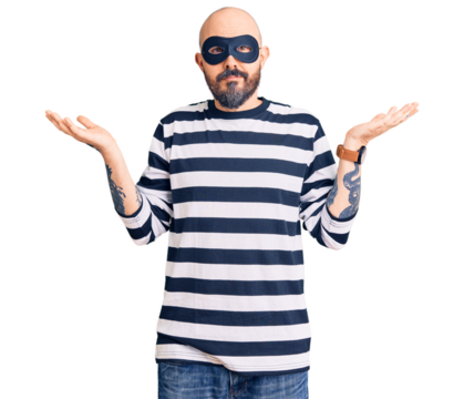 Young handsome man wearing burglar mask clueless and confused expression with arms and hands raised. doubt concept.