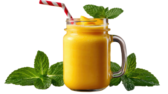 A fresh mango smoothie with a slice of mango on the rim, served in a mason jar, Transparent background, PNG file