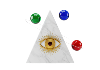 Marble pyramid with golden eye and colorful spheres isolated on transparent background, esoteric symbol for spiritual and mystical concepts