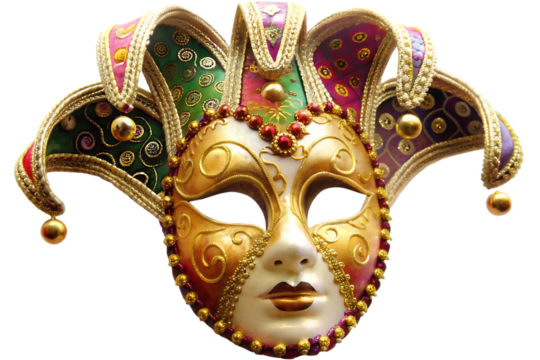 Colorful Venetian Jester Mask With Gold Embellishments On carnival costume isolated on a transparent background