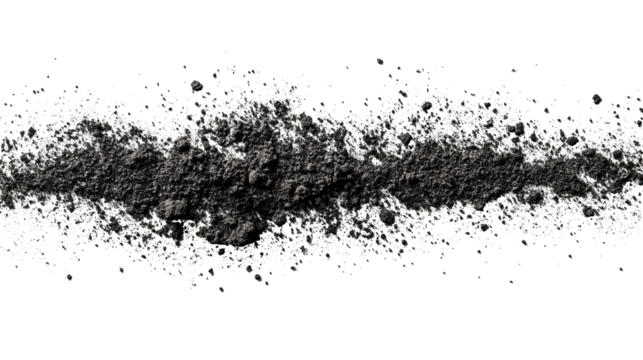 Dark, textured horizontal mass with scattered glitter-like particles against black