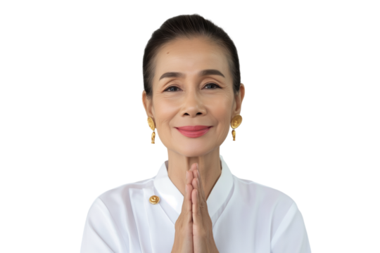 Joyful middle-aged Thai female masseuse pressing palms together isolated on transparent white background