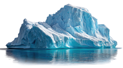 Large iceberg floating in deep blue ocean water, revealing its massive underwater structure and hidden depths, with a transparent background