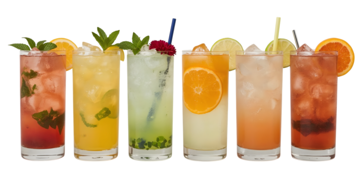 Refreshing Summer Cocktails: An array of colorful cocktails stand in a row, each a masterpiece of mixology, inviting a refreshing journey for the senses.