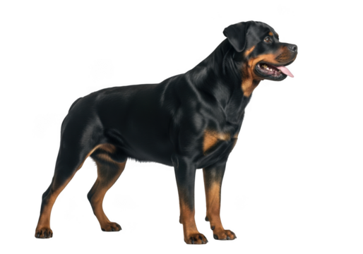 Full body standing rottweiler dog breed stock photo, canine pet animal photography, rottweilers breed, isolated on transparent background