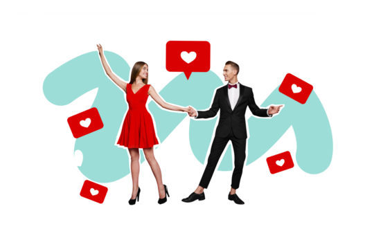 Creative drawing collage picture of dancing young couple man woman tango dress suit lovers affection love hearts signs bloggers feelings