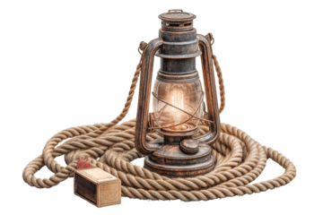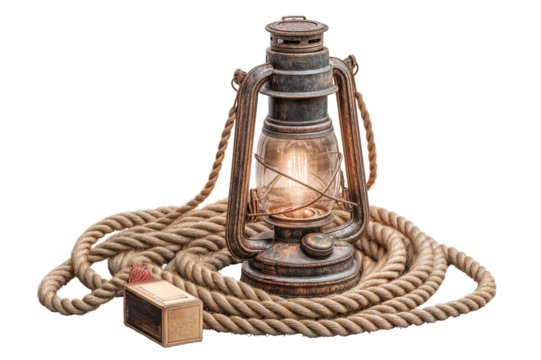 Vintage lantern with rope and matchbox still life photography for home decor and antique collectors on transparent background