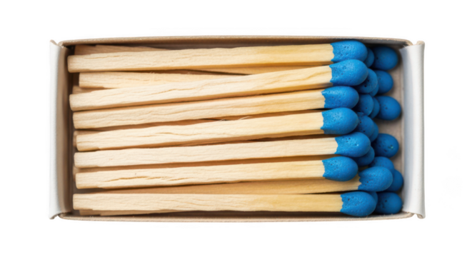 Close-up overhead view of an open matchbox with new blue-tipped wooden matches