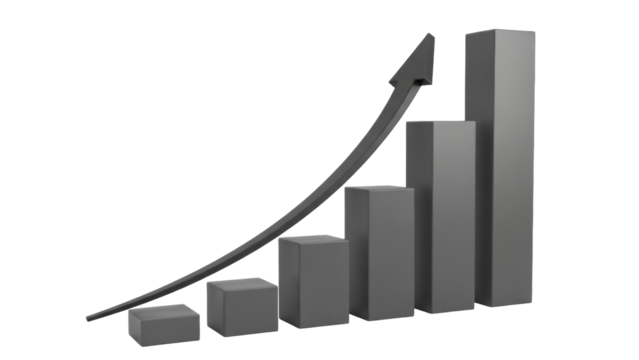 Gray 3D bar graph with arrow isolated PNG, business growth and success concept for presentations and marketing materials