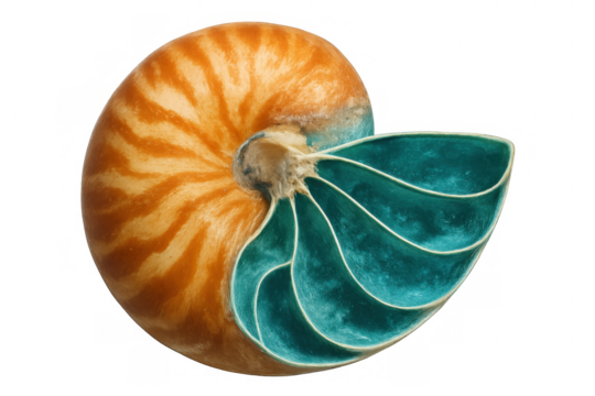 Nautilus shell showing a cutaway view with an intricate internal spiral structure and fibonacci pattern on transparent background