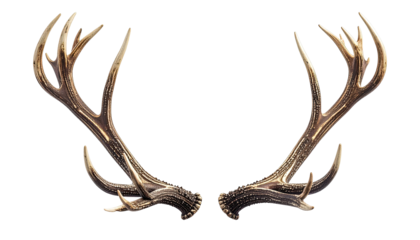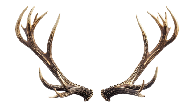 A realistic depiction of an animal hide with antlers, resting on a stark black background