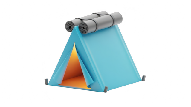 A bright blue camping tent with rolled sleeping mats on top, isolated on transparent background