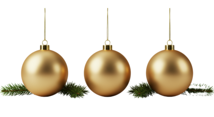 Three identical matte gold Christmas baubles with golden caps, arranged horizontally with subtle pine needles on a seamless transparent background, studio shot. Concept of elegant holiday product