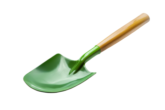 Small garden trowel with wooden handle isolated on transparent background. Green shovel with a wooden handle design for versatile gardening tasks isolated on white background.
