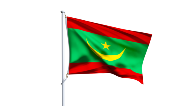 Waving flag of Mauritania with red and green colors, golden crescent and star on a pole, symbolizing national pride and identity