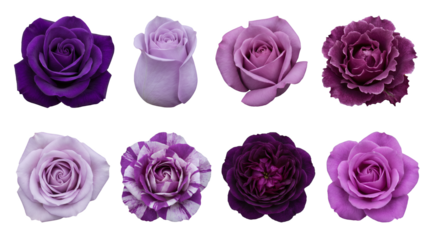 Purple rose flower set including various shades, bud, open blooms, and striped petals isolated. Floral arrangement and botanical collection.