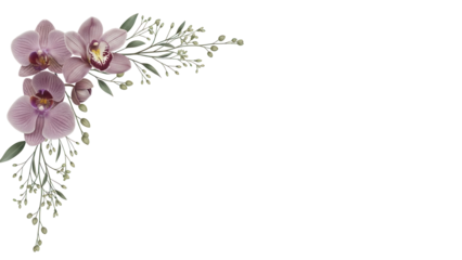 Luxury minimal floral corner border with orchids and delicate foliage in a muted mauve color isolated on white background