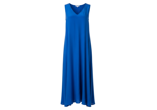 A vivid cobalt blue sleeveless maxi dress with a simple v-neckline stands out against a striking black background.