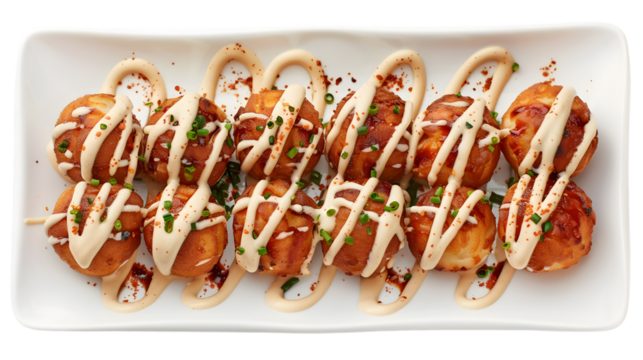 Spicy takoyaki with a sprinkling of chili flakes and drizzled with spicy mayo, arranged neatly on a transparent background plate