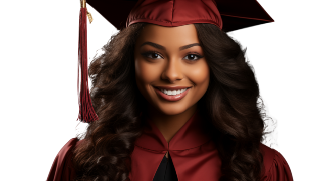 Smiling African American female college graduate wearing a cap and gown, radiating joy, isolated on transparent background.