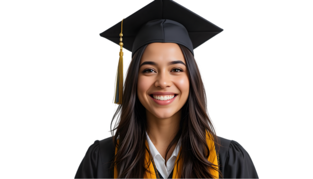 Attractive Young Indian Woman in Black Graduation Gown with Gold Tassel Smiling at Camera, isolated on transparent background PNG