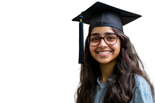 Portrait of a smiling young Indian female college student wearing a square academic cap for graduation, isolated on transparent background