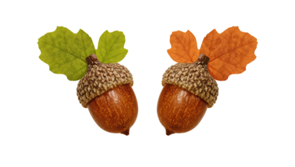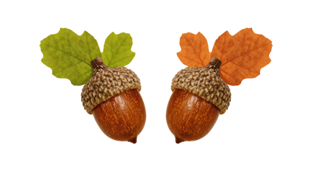 Two vibrant acorns sit side by side, each adorned with colorful leaves, suggesting the arrival of autumn