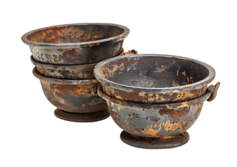 Antique-style iron measuring cups with faded gray patina isolated on a transparent background