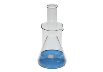Isolated Erlenmeyer flask with round bottom, graduated cylinder, and blue liquid in laboratory