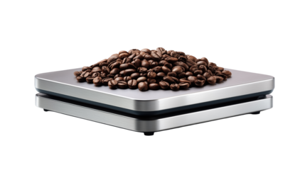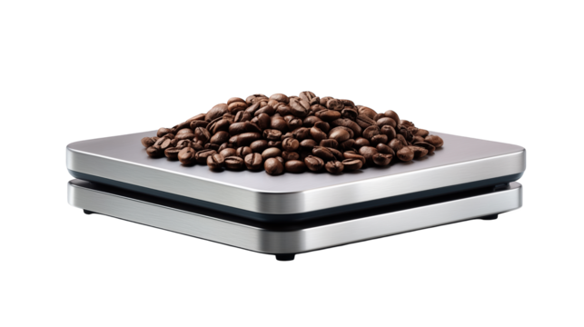 Digital kitchen scale measuring a pile of roasted coffee beans.