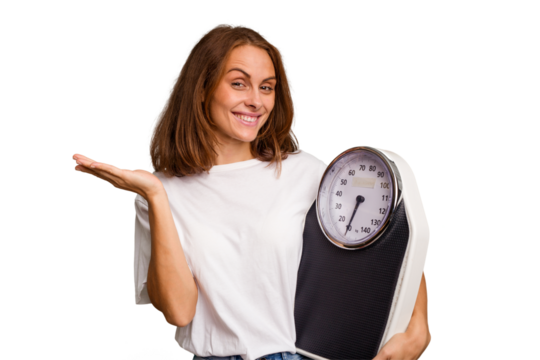 Young caucasian woman holding a scale and measure tape isolated showing a copy space on a palm and holding another hand on waist.