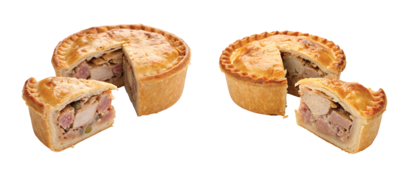 Savory Pie Snack: Small savory pie cut open revealing meat filling, sharp realistic detail, PNG