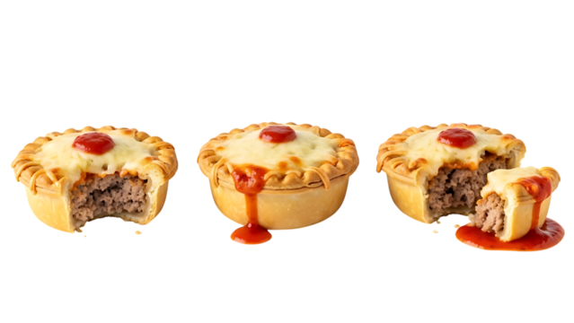 Set of Australia meat pie filled with minced meat  and topped with ketchup, isolated on white transparent background
