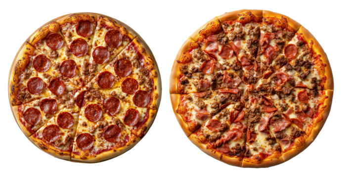 Two pizza, pepperoni and meat lovers toppers, on a transparency background.