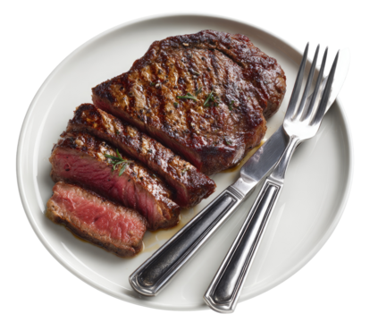 A perfectly grilled steak garnished with fresh rosemary. its juicy texture and rich color on a pristine white background. ideal for culinary publications or food blogs