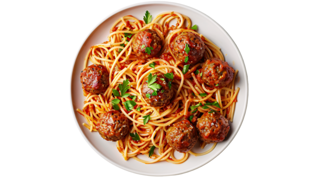 Plate of spaghetti with meatballs isolated on transparent background