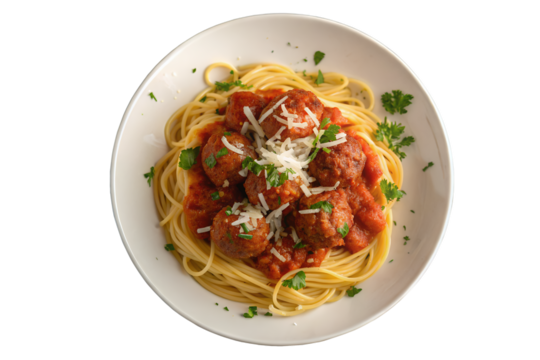 A top view of spaghetti and meatballs with tomato sauce and parmesan cheese on a white plate png on transparent background
